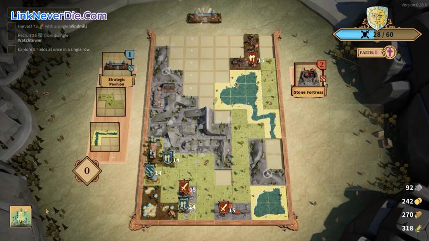 Grow in power with a rich deckbuilding system: build and enhance constructions with over 110 unique cards, each offering powerful upgrades and modifiers. Unlock new possibilities when using building or technology cards, each granting new bonus structures to boost soldier recruitment & various other perks. Customize your deck to suit your strategy and optimize your realm’s growth.