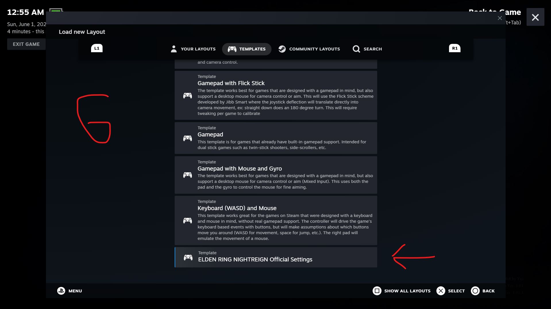9. Hãy enable steam input rồi nhấp vào phần current button layout, nhấp vào templates tìm ELDEN RiNG NIGHTREIGN Official setting --> select --> apply layout (hình 5 và 6), nếu bước này mà không thấy templates thì hãy chọn qua tay cầm khác do steam sẽ nhận cả tay cầm ps và tay cầm giả lập qua DS4 là 2 tay cầm