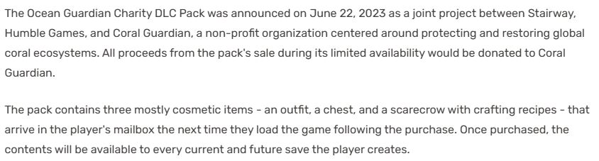 Admin ghi có 2 DLC Ocean Guardian Charity DLC Pack và Ocean Explorer Charity DLC Pack, 2 DLC này khi có thì ngay khi chơi game đã được gửi các vật phẩm thuộc DLC qua thư, tuy nhiên khi vào game thì không có, Mong ad xem xét chỉnh sửa.